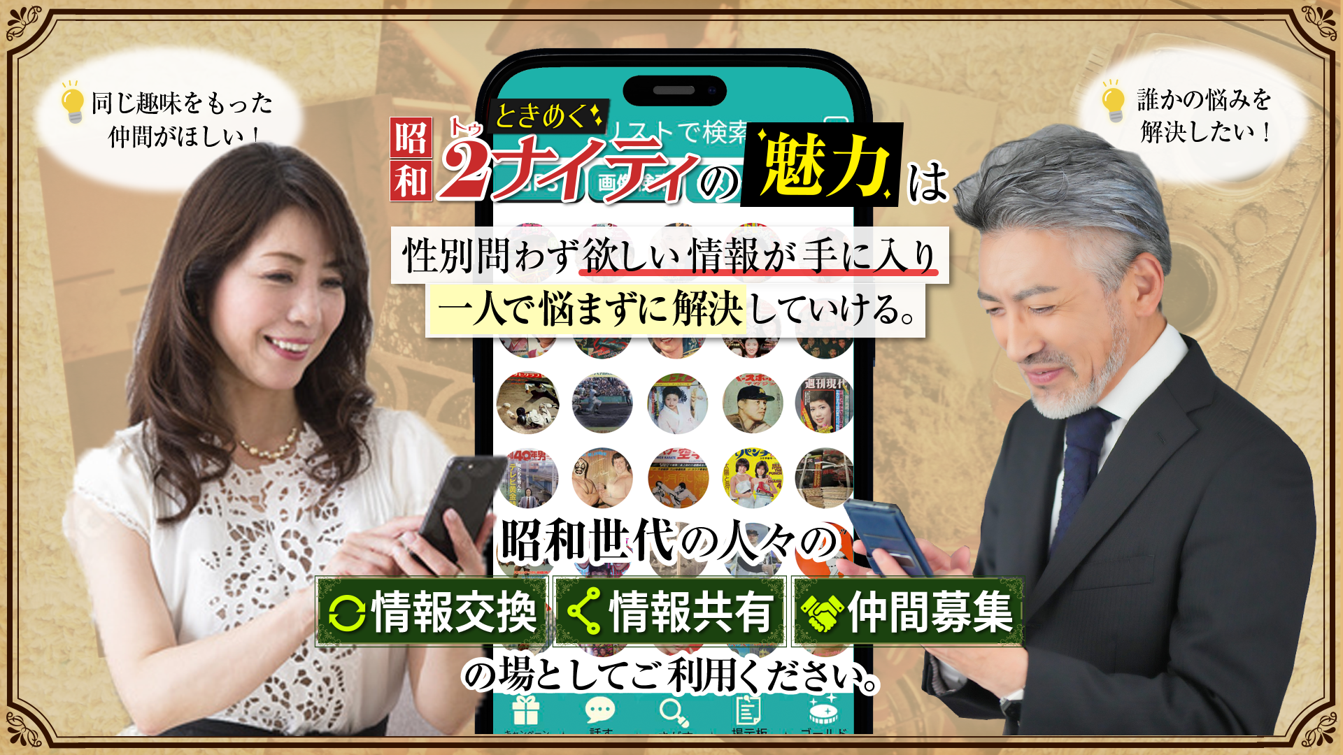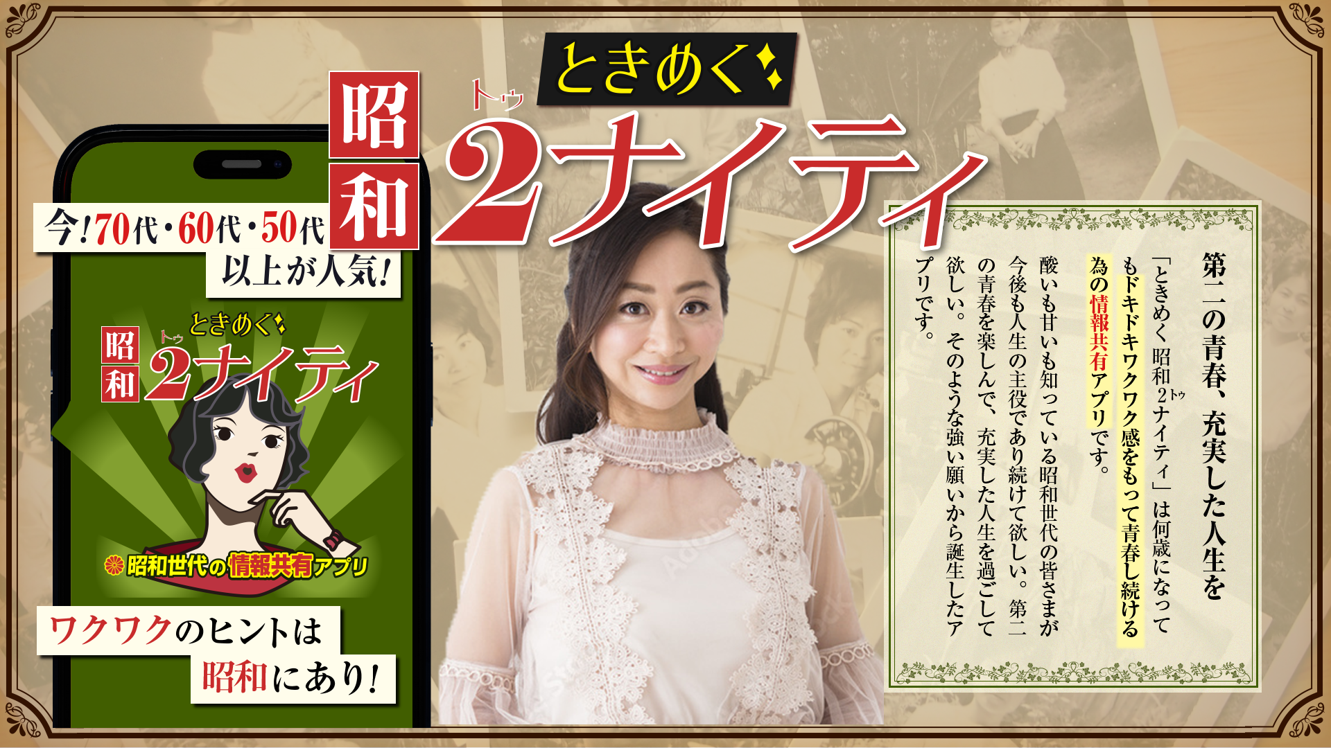 【ときめく昭和2ナイティ】は何歳になっても、ドキドキワクワク感をもって青春し続ける為の情報共有アプリです。