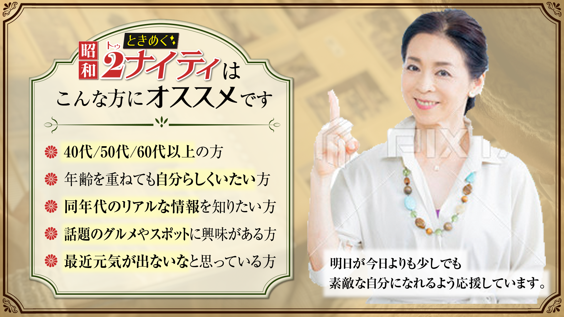 40代以上の昭和世代の方なら性別問わず欲しい情報が手に入り、一人で悩まずに解決していけるのが【ときめく昭和2ナイティ】の魅力です。